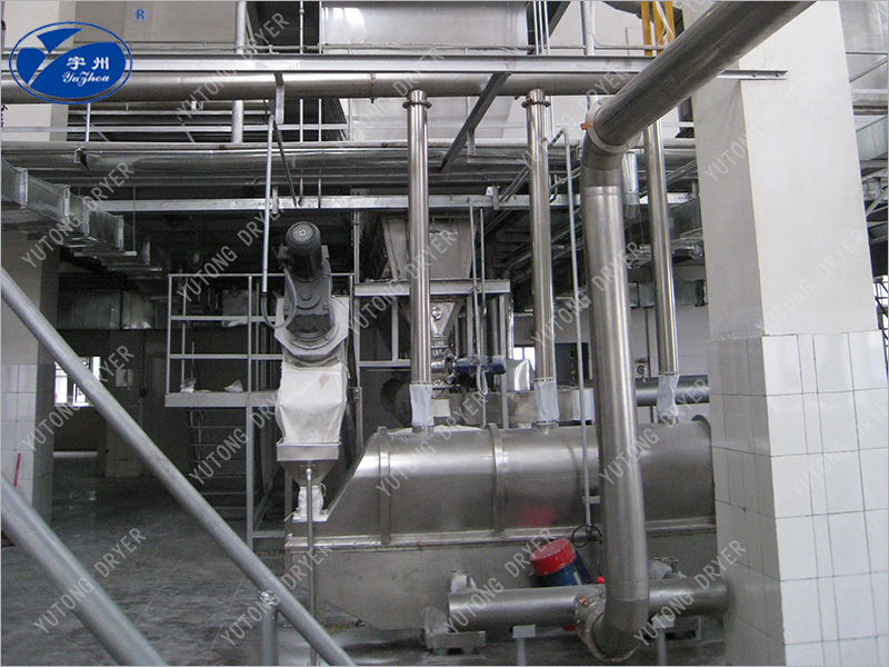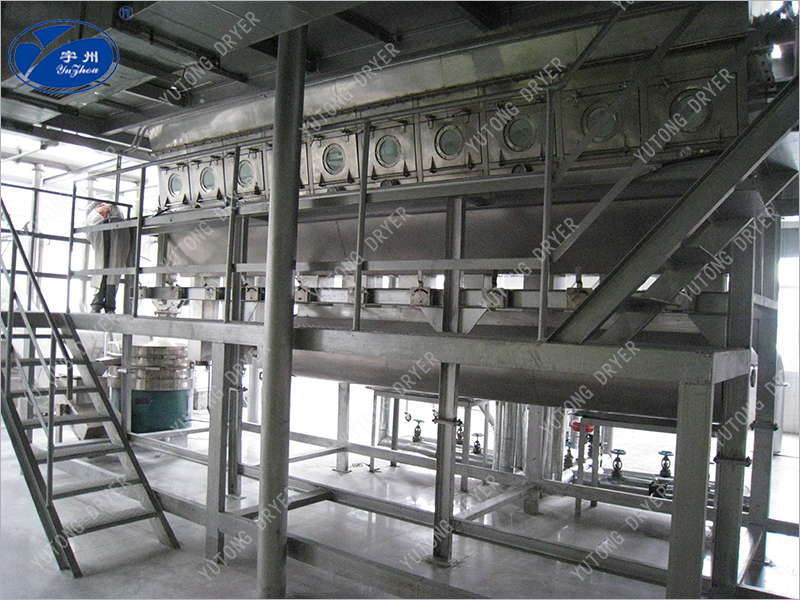 XF series horizontal boiling dryer is also known as fluidized bed or boiling bed, it is composed of air filter, boiling bed host, cyclone separator, cloth bag dust collector, high pressure centrifugal fan, operation table. Due to the different nature of dry materials, when supporting dust removal equipment, it can be considered as needed, and can choose a cyclone separator, a bag dust collector, or one of them. Generally speaking, only a cyclone separator is needed for the drying of granules and granular materials with a larger proportion. Small particles and powder materials with light specific gravity need to be matched with bag dust collector, and there are pneumatic feeding devices and belt conveyors for choice. Steam, electricity, hot blast stove can be used (according to user requirements). The granular solid material is added to the fluidized bed dryer by the feeder, the clean hot air is distributed into the bed through the valve plate, and the wet material entering from the feeder is heated into the boiling state. Due to the extensive contact between the hot air and the material, the heat and mass transfer process is enhanced, so it can be dried in a short time. The material enters from one end of the bed, after boiling and drying for tens of seconds to a few minutes, it is discharged from the discharge port, and the waste gas is discharged from the top of the boiling bed through the cyclone dust collector group and the cloth bag dust collector to recover the solid powder.