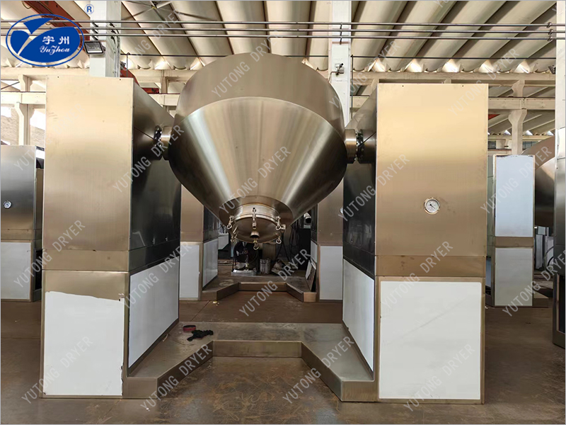 SZG series double-cone rotary vacuum dryer is a double-cone rotary tank body. The tank body is heated by heat conduction oil or hot water into the jacket under vacuum condition, and the heat is in contact with the wet material through the inner wall of the tank. The vapor or other gases that evaporate after absorbing heat from the wet material are pumped away through the vacuum pump through the vacuum exhaust pipe. Because the tank is in a vacuum state, and the rotation of the tank makes the material constantly up and down, inside and outside, it speeds up the drying speed of the material, improves the drying rate, and achieves the purpose of uniform drying.