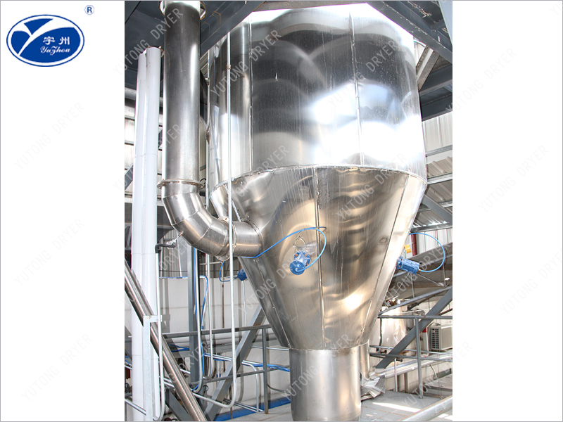 The air enters the heater through the filter, is exchanged into hot air, and enters the hot air distributor on the top of the drying chamber, so that the air uniformly enters the drying chamber in a rotating shape or parallel axis. The material liquid needs to be sieved and pumped by high pressure to the nozzle located at the top center of the drying chamber to atomize the material liquid evenly, so that the surface area of the droplet is greatly increased, and the contact with the hot air causes the water to evaporate rapidly and dry into granular products in a very short time. Most of the products are collected by the discharge port located at the bottom of the tower, and the waste gas and small powder particles are separated by the rotary wind separator. The finished product is collected by the collection cylinder at the lower end of the cyclone separator, and the exhaust gas is discharged by the extraction fan.