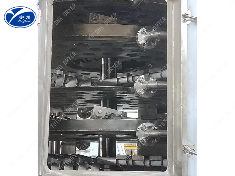 濕物料自加料器連續(xù)地加到干燥設(shè)備的D1層盤上,帶有耙葉的耙臂做回轉(zhuǎn)運(yùn)動(dòng),使耙葉連續(xù)地翻轉(zhuǎn)物料,物料沿著指數(shù)螺旋線流過干燥盤表面,在低干燥盤上的物料移到外緣,并在外緣降落到下方的高干燥盤外緣,在高干燥盤上的物料向里移動(dòng)并從中間落料落入下一層低干燥盤中,高低干燥盤上下交替排列,物料得以連續(xù)地流過整個(gè)干燥設(shè)備,中空的干燥盤內(nèi)通入加熱介質(zhì),加熱介質(zhì)從一端進(jìn)入另一端導(dǎo)出,已干燥物料從Z后一層干燥盤降落到殼體底層,最后被耙葉移動(dòng)到料口流出。蒸發(fā)出來的蒸汽經(jīng)設(shè)置在頂部的排濕口流出,溶劑經(jīng)冷凝器收回后經(jīng)真空泵流出室外。底部流出的干物料冷卻后直接包裝。