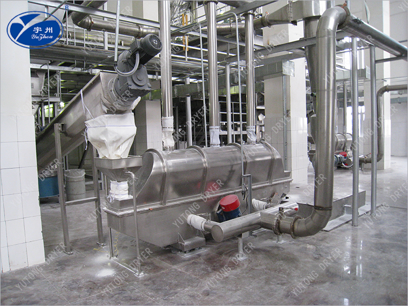 物料自進料口進入機內, 在振動力作用下, 物料沿水平方向拋擲向前連續(xù)運動,熱風向上穿過流化床同濕料換熱后, 濕空氣經旋風分離器除塵后由排風口排出, 干燥物料由排料口排出。