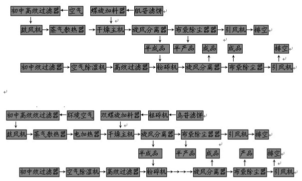 肌苷、鳥苷旋轉(zhuǎn)閃蒸干燥設(shè)備專用于肌苷與鳥苷兩種特料的干燥,干燥主機與物料接觸處均采用SUS304不銹鋼,配備了旋風(fēng)+布袋除塵兩級收料,采用蒸汽與電加熱補充的熱源方式,并配有粉碎、冷卻及氣力輸送系統(tǒng),采用PLC集中控制,自動化程度較高。