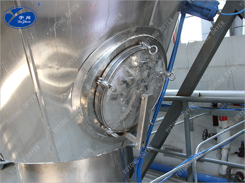 本機(jī)組工作過(guò)程為料液通過(guò)隔膜泵高壓輸入,噴出霧狀液滴,然后同熱空氣并流下降,大部分粉粒由塔底排料口收集,廢氣及其微小粉末經(jīng)旋風(fēng)分離器分離,廢氣由抽風(fēng)機(jī)排出,粉末由設(shè)在旋風(fēng)分離器下端的授粉筒收集,風(fēng)機(jī)出口還可裝備二級(jí)除塵裝置,回收率在96-98%以上。