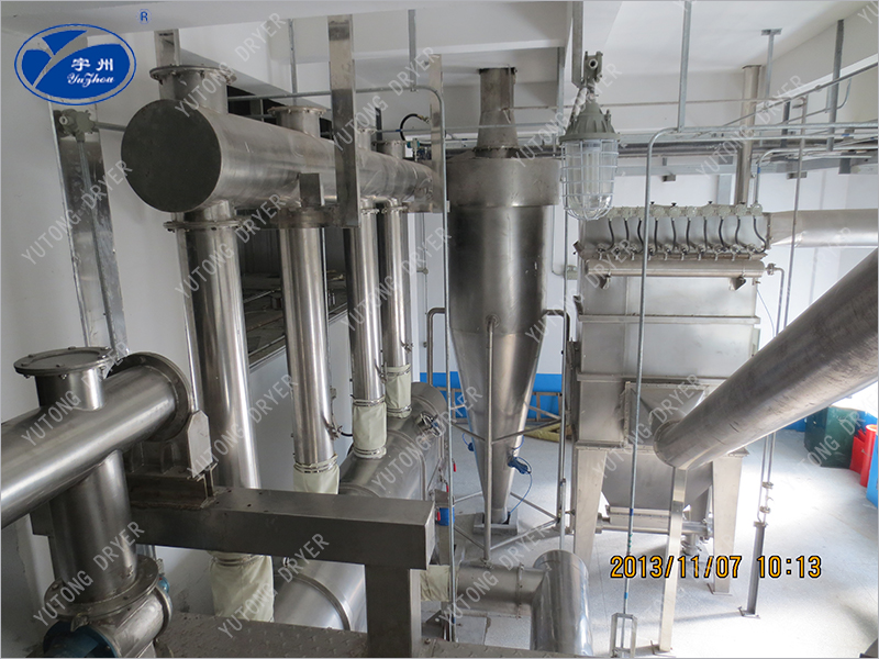 物料自進(jìn)料口進(jìn)入機(jī)內(nèi),在振動(dòng)電機(jī)或其他方式提供的激振力作用下,在空氣分布板上跳躍前進(jìn),同時(shí)空氣經(jīng)過(guò)濾后,被加熱到一定溫度,由風(fēng)口進(jìn)入干燥機(jī)下風(fēng)室中,物料在振動(dòng)力和經(jīng)空氣分布板均風(fēng)的熱氣流雙重作用下,呈懸浮狀態(tài)與熱氣流接觸,物料顆粒與熱介質(zhì)之間進(jìn)行著激烈的湍動(dòng),使傳熱和傳質(zhì)過(guò)程得以強(qiáng)化,干燥后的產(chǎn)品由排料口排出,蒸發(fā)出的水份和廢氣經(jīng)旋風(fēng)分離器回收粉塵后,排入大氣。下床體為床層提供了一個(gè)穩(wěn)定的具有一定壓力的風(fēng)室。調(diào)節(jié)引風(fēng)機(jī),使上箱體中床層物料上部保持微負(fù)壓,維持良好干燥環(huán)境并防止粉塵外泄。