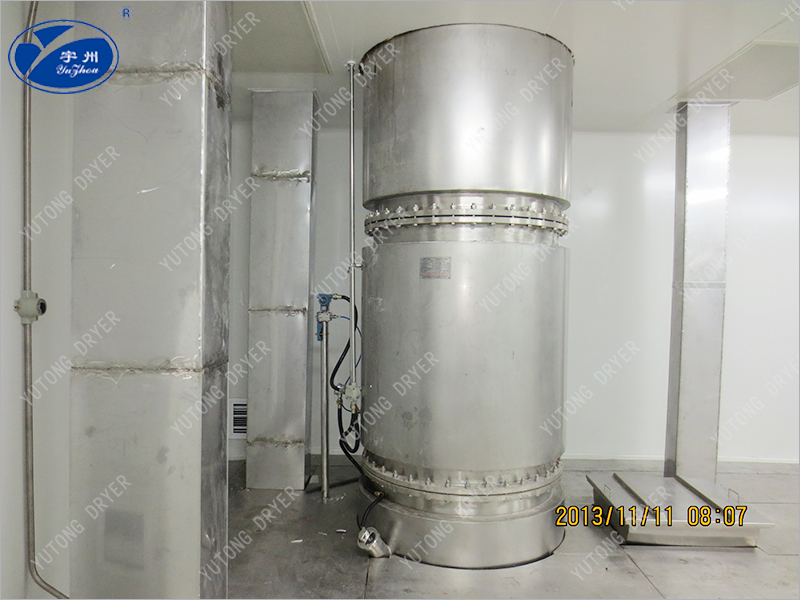 經(jīng)過初中效空氣過濾器過濾后的環(huán)境空氣,由鼓風(fēng)機送入蒸氣散熱器加熱至工藝設(shè)定溫度,進入閃蒸干燥主機,與經(jīng)過螺旋加料器送入干燥主機的待干燥濾餅,在干燥主機內(nèi)完成傳熱傳質(zhì)的干燥過程,氣固混合物由旋風(fēng)分離器、布袋除塵器分離、過濾后,物料被從干燥系統(tǒng)氣體內(nèi)分離出來,排出干燥系統(tǒng),尾氣由引風(fēng)機排入大氣。