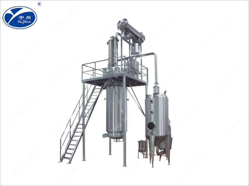 二次蒸汽繼續(xù)上升,經(jīng)冷凝器冷凝成熱冷凝液,回落到提取罐內(nèi)作新溶劑加到藥面上,新溶劑由上而下通過藥材層到提取罐底部,藥材中的可溶性有效成分溶解于溶劑內(nèi)。提取液經(jīng)抽濾管抽入濃縮器、濃縮產(chǎn)生的二次蒸汽又送到提取罐作熱源和新溶劑,這樣形成的新溶劑大回流循環(huán)提取,故藥材中溶質(zhì)密度與溶劑中含溶質(zhì)密度保持高梯度,藥材中的溶質(zhì)高速溶出,提取完畢,提取液完全被抽入濃縮器,濃縮的二次蒸汽轉(zhuǎn)送冷卻器,濃縮繼續(xù)進(jìn)行,直至濃縮至需要比重(1.2~1.34)的藥膏,放出備用。提取罐內(nèi)殘液,可放入貯罐作下批復(fù)用,藥渣從出渣門排掉,若是用有機(jī)溶劑提取,則先加適量的水,開直通和夾套蒸汽,回收溶劑后,將渣排掉。