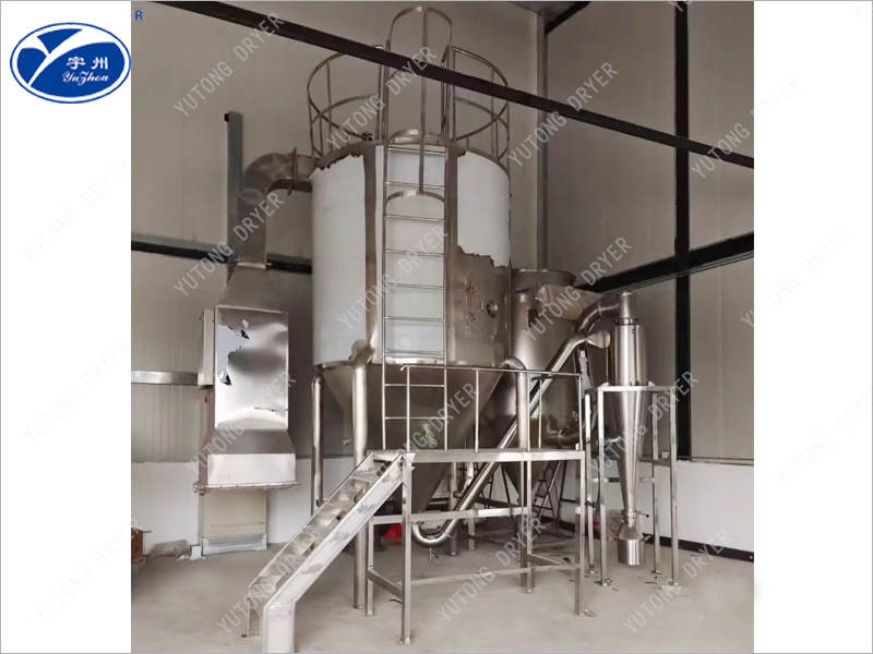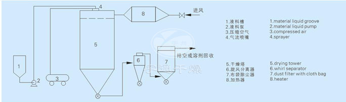 潔凈空氣加熱后進入干燥塔,在塔內(nèi)熱風(fēng)中用二流體(或三流體)噴嘴將各種料液物化成微小液滴,與熱風(fēng)進行快速熱交換,蒸發(fā)掉液料中的水份(或溶劑),并隨熱風(fēng)排出,得到粉狀產(chǎn)品。