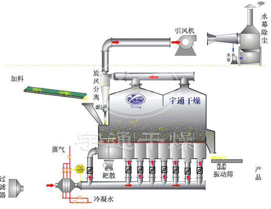 散粒狀固體物料由加料器加入流化床干燥機中, 潔凈的熱風(fēng)經(jīng)閥板分配進入床體內(nèi),從加料器進入的濕物料被熱風(fēng)形成沸騰狀態(tài)。由于熱風(fēng)與物料廣泛接觸,增強了傳熱傳質(zhì)的過程,因此在較短時間內(nèi)就可干燥。物料從床體的一頭進入,經(jīng)過幾十秒至幾分鐘沸騰干燥后由排料口排出, 廢氣由沸騰床頂部排出經(jīng)旋風(fēng)除塵器組和布袋除塵器回收固體粉料后排空。