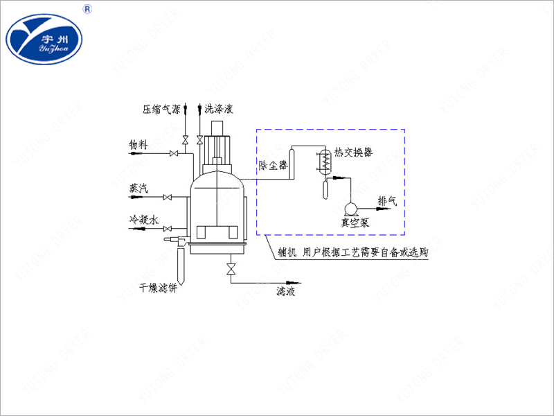 (3)吹干:充分洗滌結(jié)束后,通入壓縮空氣,對(duì)濾餅進(jìn)行吹干。需要干燥的物料,通入蒸汽或熱空氣(氮?dú)猓谡婵兆饔孟?,使物料干燥?/p>