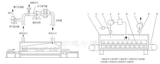 工作時(shí)熱風(fēng)以孔束流由上下同時(shí)噴向輸送帶上的物流,由于噴射氣速高達(dá)15m/s以上,故對(duì)流傳熱的膜極薄,傳熱系數(shù)大,干燥速度快,該設(shè)備用與不透氣類物料時(shí),上面噴射氣流仍返回上面,下面噴出的氣流仍返回下面,在參與循環(huán)。對(duì)透氣性物料氣流束具有強(qiáng)穿透性及在物料內(nèi)部的擴(kuò)散性。使用熱源可以是蒸汽,電,熱風(fēng)爐及燃油煙道氣等。