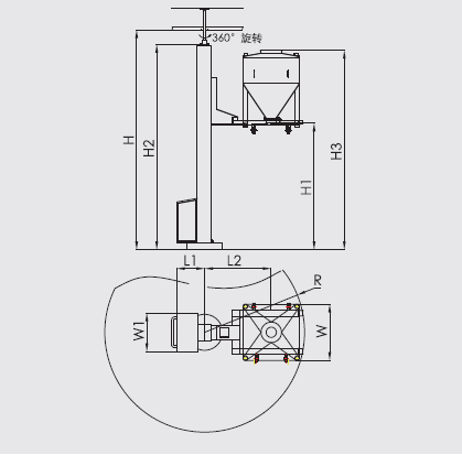 該機(jī)只要由立柱、轉(zhuǎn)動(dòng)底盤、提升叉架、液壓系統(tǒng)和控制系統(tǒng)組成。工作時(shí)將裝滿物料的料斗推入提升叉架上,操作提升操作桿,將料斗提升到加料高度后轉(zhuǎn)動(dòng)立柱與加料設(shè)備對接,打開出料蝶閥,使物料轉(zhuǎn)移到下一工序設(shè)備。